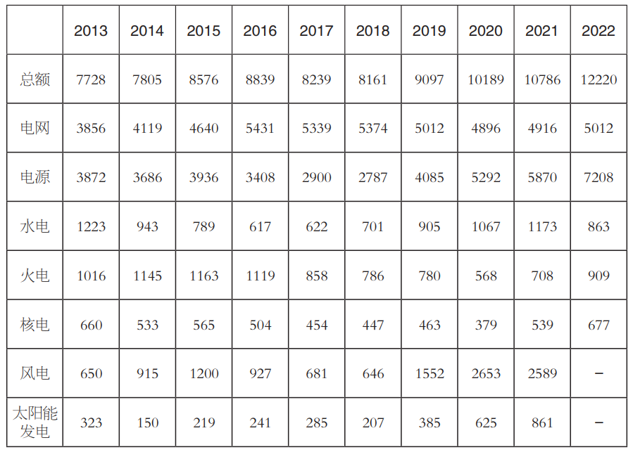 表8 2013—2022年全國(guó)電力投資情況(單位:億元)