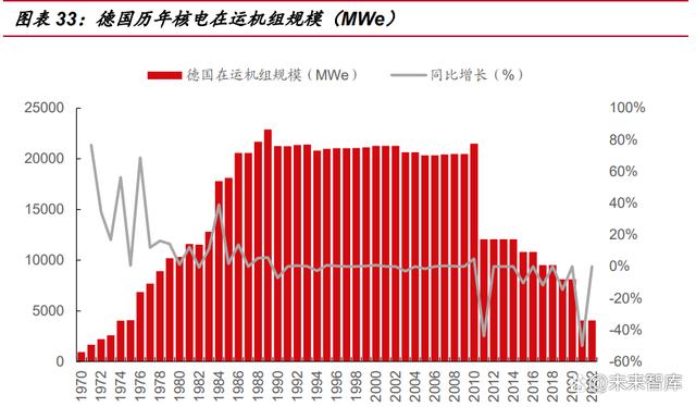 核事故安全問題引發(fā)民眾反對態(tài)度,德國核電走出倒 U 型曲線。同樣受到 1974 年能源危機影響,能源獨立問題受到關(guān)注,德國大力發(fā)展核電,直到 1989 年前德國 核電裝機都處于快速增長狀態(tài)。1986 年切爾諾貝利事故后,德國核電發(fā)展陷入停滯, 最后一座新核電站于 1989 年投入使用。 2011 年福島核事故后,德國走上了堅定退核的道路。到 2011 年初,德國 17 座 核電機組規(guī)模 21.5GW,占總電源裝機容量的 15%,核電發(fā)電量比例接近 30%。2011 年 12 月福島核電站事故后,德國多臺核電機組關(guān)停,2011 年底核電在運規(guī)模驟降至12.1GW,2022 年底僅余 3 臺機組。規(guī)模 4.1GW。受俄烏事件和北溪管道事故影響, 德國宣布暫緩核電退出計劃,推遲關(guān)停原定 2022 年內(nèi)退役的 3 座核電站。