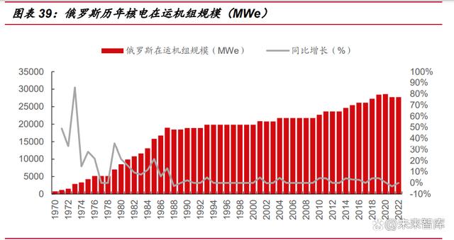 俄羅斯正處于核電的穩(wěn)步發(fā)展期,包括新技術(shù)研發(fā)以及產(chǎn)品出口。2022 年底俄 羅斯核電在運機組 27.7GW,同比持平,在建 2.7GW。2020 年俄羅斯核電發(fā)電量 2157 億 kWh,占總發(fā)電量比例 20%。除本土建設(shè)外,核電產(chǎn)品以及服務(wù)的出口是俄羅斯的重要政策和經(jīng)濟目標(biāo),20 多座核電反應(yīng)堆已確認(rèn)或計劃出口建設(shè)。