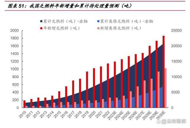 我們根據(jù)目前已公布的在運、在建以及核準待建核電機組規(guī)模進行估算,2025 當(dāng)年將產(chǎn)生 1330 噸乏燃料,累計乏燃料貯存量達 13099 噸;2030 年當(dāng)年將產(chǎn)生 1883 噸乏燃料,累計 21254 噸,考慮堆內(nèi)貯存池 10 年臨時貯存規(guī)模,2025 年、 2030 年新產(chǎn)生的離堆乏燃料分別為 426 噸、1024 噸;累計需要被處理的離堆乏燃 料分別達到 3121 噸、7095 噸。綜上,2030 年前國內(nèi)需建成具備年處理能力達到千 噸以上規(guī)模的乏燃料后處理廠,目前僅 60 噸/年。