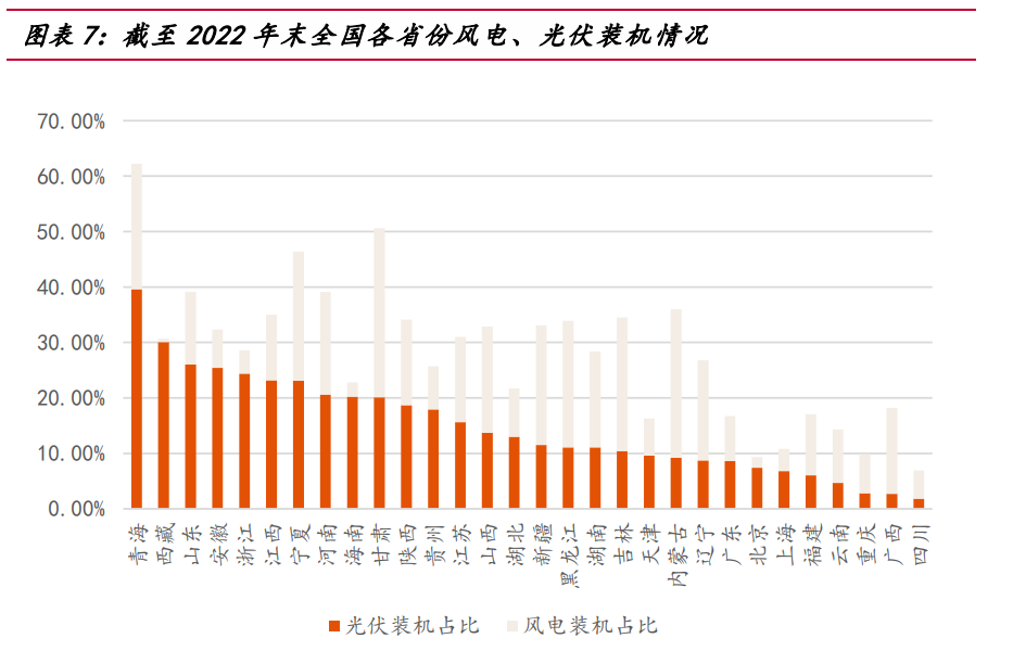 截至 2022 年末,全國各省風電、光伏裝機量占各省總裝機量比例前五名的為青 海、西藏、河北、寧夏、安徽(按光伏裝機排序);全國各省風電、光伏發(fā)電量占各 省總發(fā)電量比例前五名的為青海、西藏、寧夏、甘肅、山東。 考慮到新能源滲透率與分時電價特征高度相關(guān),因此全國多個省份均可出現(xiàn)類似 山東省的電價分時特征,如青海、寧夏、甘肅等。