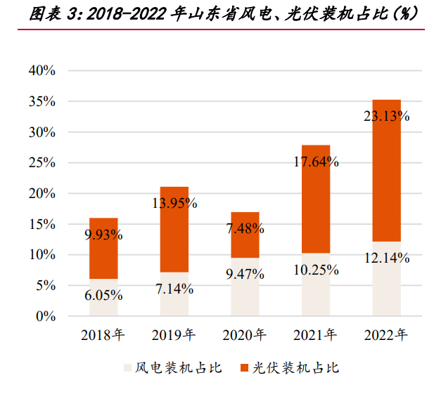在新能源占比較高的地區(qū),相應(yīng)時段電價較低。由于新能源發(fā)電邊際成本低的特 質(zhì),在新能源高發(fā)期間,如果用電需求較低,則相應(yīng)時段市場電價較低。以山東省電 力現(xiàn)貨市場為例: 2018-2022 年,山東省風電、光伏裝機容量及發(fā)電量持續(xù)增長,風電、光伏裝機 容量自 1146/1361 萬千瓦增長至 2302/4270 萬千瓦,CAGR 達 14.97%/25.69%,風電、 光伏裝機占總裝機量比例自 6.05%/9.93%擴張至 12.14%/23.13%;風電、光伏發(fā)電量 占總發(fā)電量比例自 2.32%/0.55%擴張至 5.28%/11.25%。