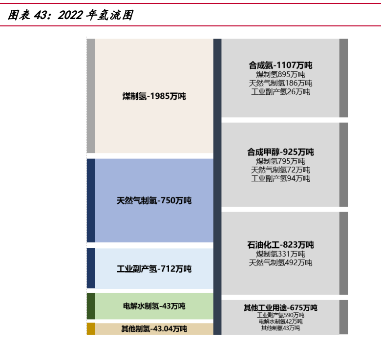 當前國內(nèi)氫能大部分應用于工業(yè)領域,包括合成氨、合成甲醇及石油化工。隨著 長期碳中和目標的提出,氫氣的能源屬性將逐漸顯現(xiàn),應用領域?qū)⒅鸩酵卣怪岭娏Α?交通、建筑等場景。以中國 2022 年氫產(chǎn)能下游應用為例,其中合成氨氫氣需求 1107 萬噸,占 31.1%。合成氨作為化肥和其他化工產(chǎn)品的重要原材料,60%用于農(nóng)業(yè)化肥生 產(chǎn),30%用于工業(yè)生產(chǎn),而交通部門(船舶運輸)和發(fā)電部門(摻氨燃燒)占比很低。 合成甲醇氫氣需求 925 萬噸,占 26.2%。合成甲醇大部分用于化工合成,主要合成 產(chǎn)品為烯烴、甲醛、醋酸、MTBE 以及二甲醛等。石油煉化氫氣需求 823 萬噸, 占 23.3%。 未來,氫氣因其熱值高,質(zhì)量能量密度大的特點或?qū)⒈粡V泛應用于交通領域,氫 燃料電池汽車比傳統(tǒng)的純電動車具備更長的續(xù)航能力。2022 年我國氫燃料電池車累 計銷量 12682 輛,加氫站累計建成 274 座,依據(jù)中國國家發(fā)展和改革委員會發(fā)布《氫 能產(chǎn)業(yè)發(fā)展長期規(guī)劃(2021-2035)》提出,到 2025 年燃料電池車輛保有量約為 5 萬 輛。同時,因氫氣單位質(zhì)量的熱值遠大于天然氣,能夠更好地滿足建筑供熱需求而應 用于建筑發(fā)電等其他領域。