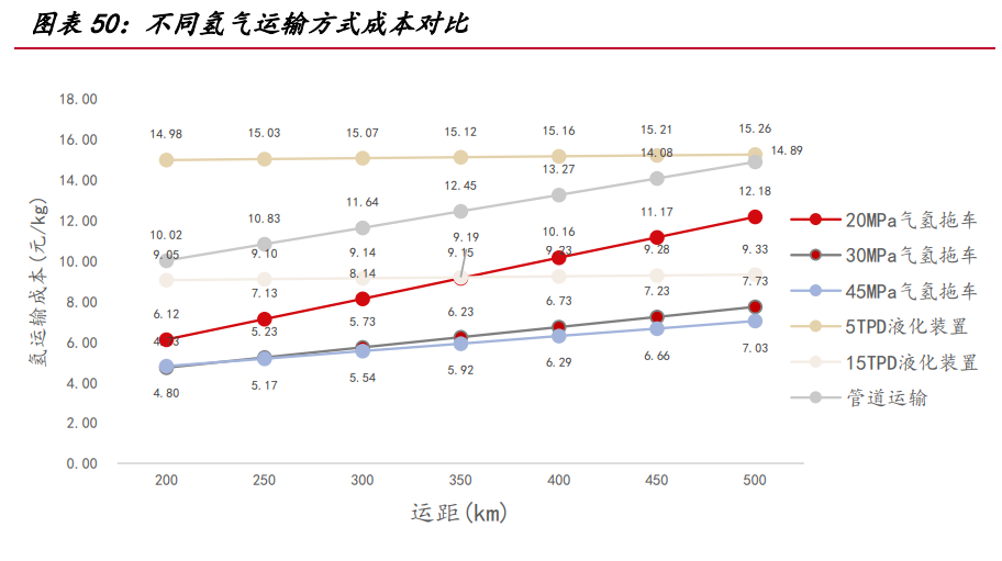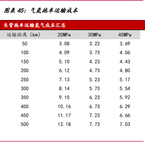 氣氫拖車是目前國內(nèi)最成熟的氫氣運輸形式,我國氫氣管束式集裝箱和氫氣長管 拖車大多采用鋼制大容積無縫高壓氣瓶和鋼制內(nèi)膽碳纖維環(huán)向纏繞氣瓶,工作壓力通 常為 20Mpa,單次運輸氫氣質(zhì)量小,運輸效率低,適用于 200 公里以內(nèi)的短距離運輸。 綜合市場上管束式氫氣集裝箱的平均輸氫量,假設 20/30/45MPa 管束式集裝箱最大可 運輸氫氣質(zhì)量 340/650/950 千克,管束式集裝箱費用 60/70/80 萬,單位壓縮電耗 2/4.5/6kWh/kg,則運距 500 公里的運輸成本高達 7 元/kg 以上。