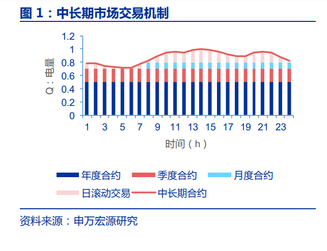 如果把上述五個方向繼續(xù)向下展開,涉及到的品種多達十幾種,紛繁復(fù)雜的電力交易 品種以及各不相同的機制提高了對電力市場研究的門檻。但從電力系統(tǒng)運行的本質(zhì)來說, 不論是電能量市場、輔助服務(wù)市場還是容量電價,大體上都是要實現(xiàn)兩個功能:有功平衡 和無功平衡。 有功平衡即電力系統(tǒng)需要保持發(fā)電功率和用電負荷時時刻刻相等。為了保證供電的可 靠性以及用電成本的穩(wěn)定性,用戶側(cè)需要提前安排和預(yù)測其未來的用電需求,發(fā)電側(cè)需要提前預(yù)測其未來出力情況(風電、光伏、水電等)或安排發(fā)電計劃(化石能源),因此需 要提前簽訂用電合約來使供需平衡。但不論新能源的出力還是用電計劃,距離用電時間越 遠把握性越小,所以根據(jù)簽訂合約時點與實際用電時點的遠近,可以分為中長期和現(xiàn)貨交 易,本質(zhì)目的是對電力合約進行分解,使得電力合約與實際用電需求盡量匹配。 中長期交易從時間尺度上可以分為年度合約、季度合約、月度合約等,現(xiàn)貨交易則主 要分為日前、日內(nèi)和實時現(xiàn)貨交易。將電能量市場根據(jù)時間尺度不同分解為不同的產(chǎn)品, 本質(zhì)上是在市場靈活性和交易成本之間取平衡,時間尺度越長靈活性越差,交易成本越低, 反之則靈活性越強但交易成本越高。