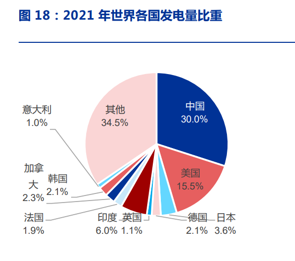 我國(guó)面臨著人類歷史上最為艱巨的新能源轉(zhuǎn)型之路。中國(guó)如今已經(jīng)擁有全世界最大的 電力系統(tǒng),2021 年我國(guó)發(fā)電量占全球比例已達(dá)到 30%,接近第二名美國(guó)的 2 倍,更重要 的是我國(guó)的用電規(guī)模仍在快速增長(zhǎng),2021 年我國(guó)全年新增發(fā)電量達(dá) 7552 億千瓦時(shí)(BP 口徑),是德國(guó) 2021 年全國(guó)用電量的接近 1.3 倍,而德國(guó)總發(fā)電量從近 20 年基本維持在 穩(wěn)定水平。