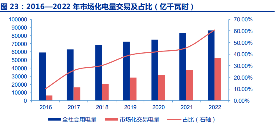 電力交易業(yè)務(wù)是電力市場化最直接收益的業(yè)務(wù)。由于電力市場的設(shè)計(jì)復(fù)雜,各地交易 規(guī)則、品種不一,同時(shí)也要求對整個(gè)電力系統(tǒng)的運(yùn)行規(guī)律有深刻理解,是高度專業(yè)化的業(yè) 務(wù),電力交易決策本身對于電力市場參與者的收益造成較大影響。 市場化售電規(guī)模有快速擴(kuò)張潛力。根據(jù)中電聯(lián)相關(guān)數(shù)據(jù),2022 年我國市場化交易電量 規(guī)模達(dá)到 5.25 萬億千瓦時(shí),占全社會(huì)總用電量的規(guī)模已超過 60%,考慮到優(yōu)先購用電,直 觀看起來售電規(guī)模增長空間有限。但實(shí)際上:(1)我國目前市場化交易電量大部分仍通過 電網(wǎng)代理購電,直接購電以及通過售電公司購電比例較低;(2)我國電力現(xiàn)貨市場才開始 推廣,雖然各地要求中長期電量占比要達(dá)到 70%—90%以上,但由于絕大多數(shù)省份現(xiàn)貨市 場均采用全電量結(jié)算,因此實(shí)際的現(xiàn)貨交易量可能會(huì)接近全社會(huì)用電量。以廣東省為例, 2022 年全省本地機(jī)組發(fā)電量 5844 億千瓦時(shí),中長期交易電量 2871 億千瓦時(shí),現(xiàn)貨市場 總交易量達(dá) 3801 億千瓦時(shí)。