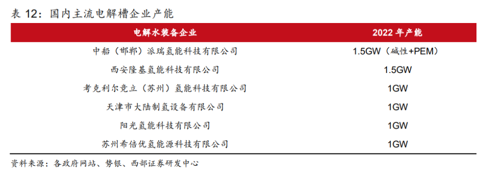 電解水制氫是指水分子在直流電作用下被解離生成氧氣和氫氣,分別從電解槽陽極和陰極 析出。根據工作原理和電解質的不同,電解水制氫技術通常分為四種,分別是堿性電解水 技術(ALK)、質子交換膜電解水技術(PEM)、高溫固體氧化物電解水技術(SOEC)和 固體聚合物陰離子交換膜電解水技術(AEM)。 電解水制氫技術以堿性電解為主,PEM 電解次之。“雙碳”目標提出后,國內電解水制氫 項目規(guī)劃和推進逐步加快,2022 年國內堿性電解槽企業(yè)已披露產能接近 11GW,堿性電 解水制氫技術已完成商業(yè)化進程,產業(yè)鏈發(fā)展成熟,且具備成本優(yōu)勢,已實現大規(guī)模應用; PEM 電解水技術則處于商業(yè)化初期,產業(yè)鏈國產化程度不足,電解槽雙極板、膜材料以及 鉑、銥等貴金屬催化劑材料成本更高且極度依賴進口;高溫固體氧化物電解水技術和固體 聚合物陰離子交換膜電解水技術還處于研發(fā)示范階段,未實現商業(yè)化應用。