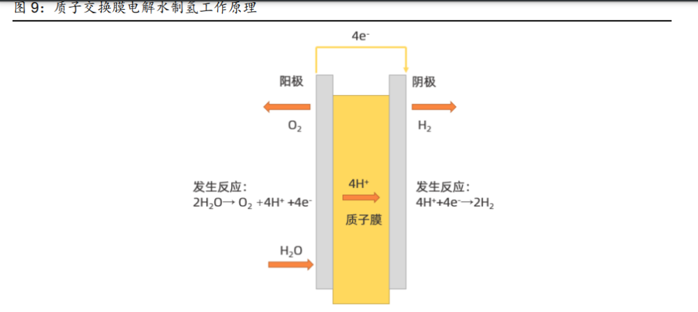 質子交換膜電解水制氫技術簡稱 PEM(Proton exchange membrane),和堿性電解水制 氫的區(qū)別是,PEM 電解制氫使用質子交換膜作為固體電解質替代堿性電解槽使用的隔膜 和堿性電解液,避免了潛在的堿液污染和腐蝕問題,安全性更高。 質子交換膜電解水制氫同樣是是純水發(fā)生電化學反應分解產生氧氣和氫氣的過程。電解水 的能源則利用太陽能、風能和水力發(fā)電等零碳能源,制氫過程無污染排放,是最清潔環(huán)保 的“綠氫”。