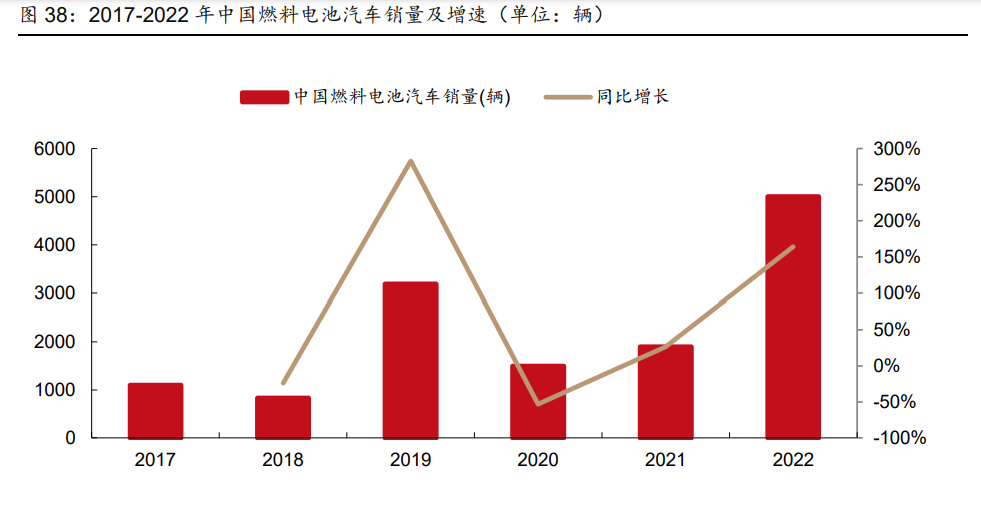 中國(guó)燃料電池汽車銷量增速明顯,商用車占據(jù)主導(dǎo)地位。2016-2019 年我國(guó)燃料電池汽 車銷量持續(xù)增長(zhǎng),2020 年受疫情和補(bǔ)貼政策退坡等因素的影響,燃料電池汽車銷量出現(xiàn) 下降,而在 2021 年燃料電池汽車銷量恢復(fù)增長(zhǎng),到 2022 年底,我國(guó)燃料電池汽車銷量 達(dá)到 5006 輛,同比增長(zhǎng) 164.17%。國(guó)內(nèi)燃料電池汽車保有量持續(xù)增長(zhǎng),2022 年達(dá)到 12306 輛,同比增長(zhǎng) 37.68%。根據(jù)《中國(guó)氫能產(chǎn)業(yè)發(fā)展報(bào)告 2022》,預(yù)計(jì)至 2025 年,中國(guó)燃料 電池汽車保有量將發(fā)展到 5-10 萬(wàn)輛,預(yù)計(jì)至 2030 年,燃料電池汽車將實(shí)現(xiàn)商業(yè)化運(yùn)營(yíng)。 從車型類別來(lái)看,2022 年,我國(guó)燃料電池汽車銷量中,商用車占據(jù)主導(dǎo)地位,乘用車占比 僅為 4.47%。根據(jù)國(guó)際能源署統(tǒng)計(jì)數(shù)據(jù),在國(guó)內(nèi)燃料電池客車和商用車政策推動(dòng)下,我國(guó) 在全球燃料電池公交車和商用車領(lǐng)域中占據(jù)主導(dǎo)地位。