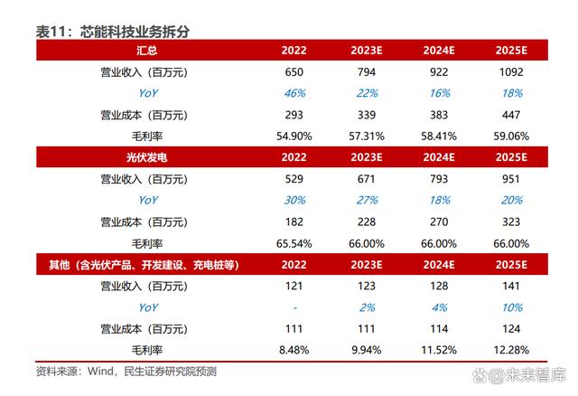 芯能科技業(yè)務(wù)拆分: 22 年業(yè)務(wù)結(jié)構(gòu)收入占比:光伏發(fā)電(81%)+光伏產(chǎn)品(12%)+開發(fā)建設(shè)(4%) +充電樁(1%)+其他業(yè)務(wù)(1%)。其中光伏產(chǎn)品、開發(fā)建設(shè)主要以配套光伏發(fā)電 業(yè)務(wù)為主。 光伏發(fā)電業(yè)務(wù):受益于大工業(yè)電價(jià)同比上調(diào)以及公司自持電站規(guī)模持續(xù)擴(kuò)大、光伏 發(fā)電量穩(wěn)步增加,同時(shí),在分布式光伏整縣推進(jìn)背景下,EPC 及運(yùn)維服務(wù)業(yè)務(wù)的市 場空間進(jìn)一步打開,公司光伏發(fā)電業(yè)務(wù)穩(wěn)定增長。根據(jù)公司轉(zhuǎn)債問詢函回復(fù),未來 三年公司計(jì)劃以分布式光伏并網(wǎng)裝機(jī)容量不低于 15%的年化增長率持續(xù)擴(kuò)大自持分布式光伏電站建設(shè)投入,我們預(yù)計(jì)公司光伏發(fā)電業(yè)務(wù) 23-25 年收入增速分別為 27%/18%/20%。