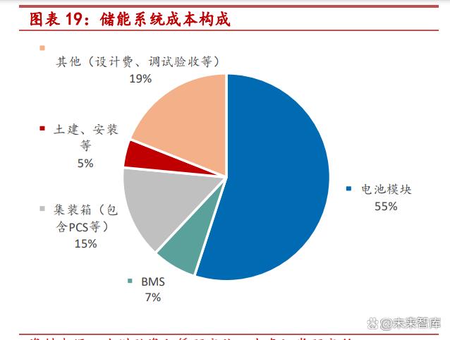 電池為儲能系統(tǒng)第一大成本。儲能系統(tǒng)成本主要由五部分構(gòu)成:電池模 塊、BMS 系統(tǒng)、集裝箱(含 PCS 等)、土建及安裝費用、其他設(shè)計調(diào)試 費。以浙江省一工廠的 3MW/6.88MWh 儲能系統(tǒng)成本為例,電池模塊占總 成本的 55%。