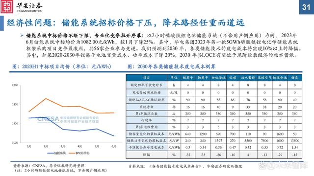 經(jīng)濟(jì)性問題:儲(chǔ)能系統(tǒng)招標(biāo)價(jià)格下壓,降本路徑任重而道遠(yuǎn)。儲(chǔ)能系統(tǒng)中標(biāo)價(jià)格不斷下探,專業(yè)化競爭拉開序幕:以2小時(shí)磷酸鐵鋰電池儲(chǔ)能系統(tǒng)(不含用戶側(cè)應(yīng)用)為例,2023年6月儲(chǔ)能系統(tǒng)中標(biāo)均價(jià)為1082.00元/kWh,較1月下降25%。其中,華電集團(tuán)2023年第一批5GWh磷酸鐵鋰電化學(xué)儲(chǔ)能系統(tǒng)框架采購項(xiàng)目競爭最激烈,共56家企業(yè)參與競逐。我們預(yù)測到2030 年,各類儲(chǔ)能技術(shù)的度電成本將實(shí)現(xiàn)10%以上的降幅。其中,如果2020-2030年鋰離子電池容量成本、功率成本下降 20%,2030 年其LOCE有望低于現(xiàn)階段最經(jīng)濟(jì)的抽水蓄能。