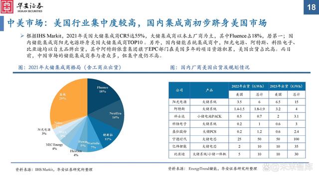 根據(jù)IHS Markit,2021年美國大儲(chǔ)集成商CR5達(dá)55%,大儲(chǔ)集成商以本土廠商為主,其中Fluence占18%,居第一;國內(nèi)儲(chǔ)能集成商陽光電源躋身美國大儲(chǔ)集成商TOP10 。另外,國內(nèi)儲(chǔ)能系統(tǒng)集成商中,陽光電源、阿特斯、科陸電子、比亞迪均以自主品牌出貨,其中阿特斯依靠集團(tuán)旗下EPC部門在美國多年的項(xiàng)目資源積累,美國出貨占比高。而目前,中國市場的儲(chǔ)能集成商參與者眾多,但集中度仍不高。