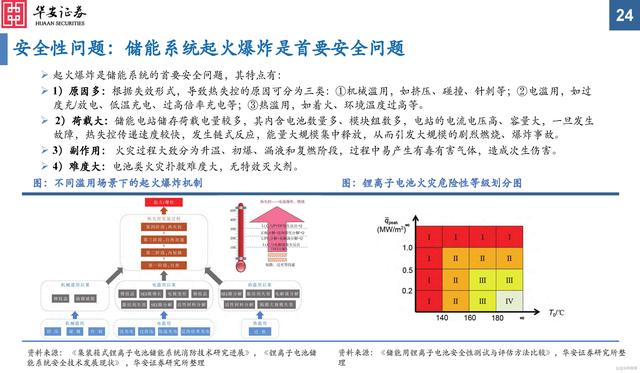 起火爆炸是儲(chǔ)能系統(tǒng)的首要安全問題,其特點(diǎn)有: 1)原因多:根據(jù)失效形式,導(dǎo)致熱失控的原因可分為三類:①機(jī)械濫用,如擠壓、碰撞、針刺等;②電濫用,如過度充/放電、低溫充電、過高倍率充電等;③熱濫用,如著火、環(huán)境溫度過高等。 2)荷載大:儲(chǔ)能電站儲(chǔ)存荷載電量較多,其內(nèi)含電池?cái)?shù)量多、模塊組數(shù)多,電站的電流電壓高、容量大,一旦發(fā)生故障,熱失控傳遞速度較快,發(fā)生鏈?zhǔn)椒磻?yīng),能量大規(guī)模集中釋放,從而引發(fā)大規(guī)模的劇烈燃燒、爆炸事故。3)副作用: 火災(zāi)過程大致分為升溫、初爆、漏液和復(fù)燃階段,過程中易產(chǎn)生有毒有害氣體,造成次生傷害。 4)難度大:電池類火災(zāi)撲救難度大,無特效滅火劑。
