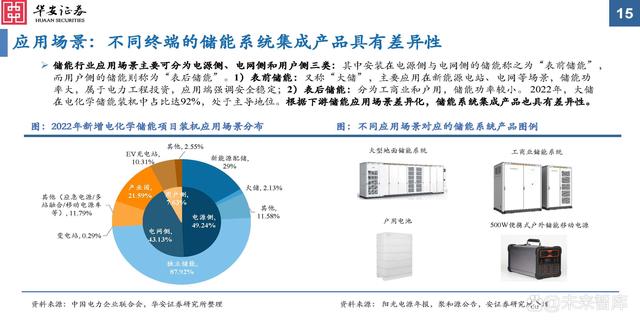 儲(chǔ)能行業(yè)應(yīng)用場景主要可分為電源側(cè)、電網(wǎng)側(cè)和用戶側(cè)三類:其中安裝在電源側(cè)與電網(wǎng)側(cè)的儲(chǔ)能稱之為“表前儲(chǔ)能”,而用戶側(cè)的儲(chǔ)能則稱為“表后儲(chǔ)能”。1)表前儲(chǔ)能:又稱“大儲(chǔ)”,主要應(yīng)用在新能源電站、電網(wǎng)等場景,儲(chǔ)能功率大,屬于電力工程投資,應(yīng)用端強(qiáng)調(diào)安全穩(wěn)定;2)表后儲(chǔ)能:分為工商業(yè)和戶用,儲(chǔ)能功率較小。2022年,大儲(chǔ)在電化學(xué)儲(chǔ)能裝機(jī)中占比達(dá)92%,處于主導(dǎo)地位。根據(jù)下游儲(chǔ)能應(yīng)用場景差異化,儲(chǔ)能系統(tǒng)集成產(chǎn)品也具有差異性。