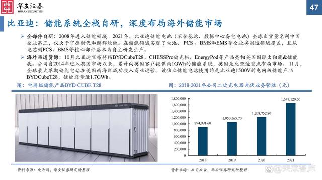 海外渠道資源:10月比亞迪宣布將攜BYDCubeT28、CHESSPro儲(chǔ)充柜、EnergyPod等產(chǎn)品亮相英國國際太陽能&儲(chǔ)能展。公司自2014年進(jìn)入英國市場以來,累計(jì)向英國客戶提供約1GWh的儲(chǔ)能系統(tǒng),英國是比亞迪重點(diǎn)布局市場。11月,全球最大單期儲(chǔ)能電站在美國西海岸成功投入商業(yè)運(yùn)營。該獨(dú)立儲(chǔ)能電站使用的是比亞迪1500V的電網(wǎng)級(jí)儲(chǔ)能產(chǎn)品BYDCubeT28,儲(chǔ)能容量近1.7GWh。