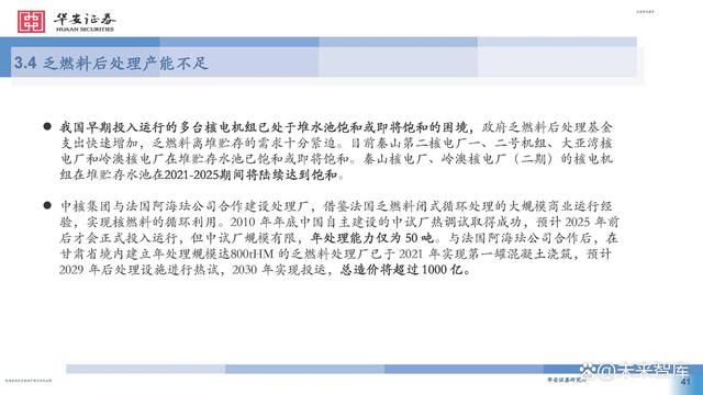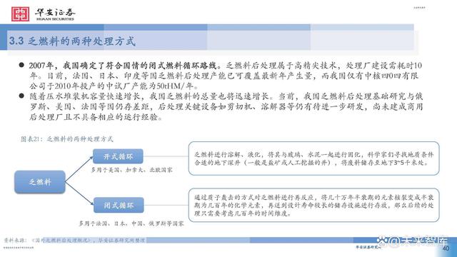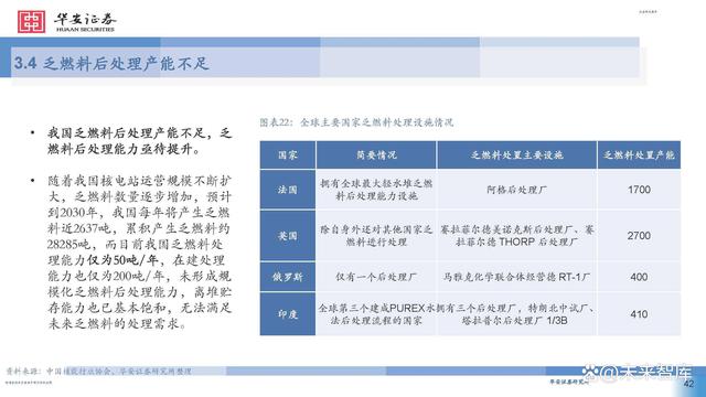 2007年,我國確定了符合國情的閉式燃料循環(huán)路線。乏燃料后處理屬于高精尖技術(shù),處理廠建設(shè)需耗時(shí)10 年。目前,法國、日本、印度等國乏燃料后處理產(chǎn)能已可覆蓋最新年產(chǎn)生量,而我國僅有中核四0四有限 公司于2010年投產(chǎn)的中試廠產(chǎn)能為50tHM/年。 隨著壓水堆裝機(jī)容量快速增長,我國乏燃料的總量也將迅速增長。當(dāng)前,我國乏燃料后處理基礎(chǔ)研究與俄 羅斯、美國、法國等國仍存差距,后處理關(guān)鍵設(shè)備如剪切機(jī)、溶解器等仍有待進(jìn)一步研發(fā),尚未建成商用 后處理廠且不具備相應(yīng)的運(yùn)行經(jīng)驗(yàn)。