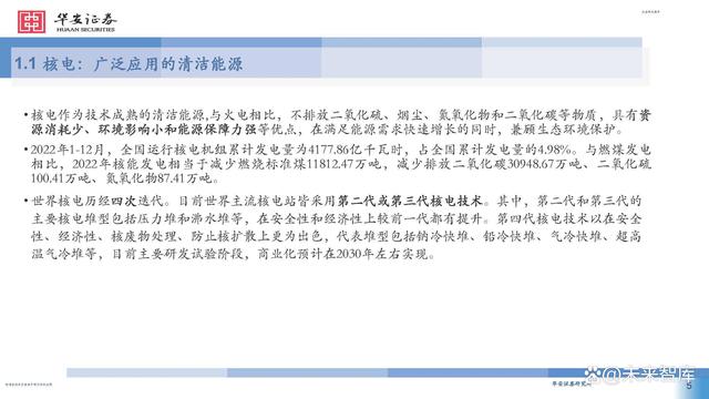 2022年1-12月,全國運(yùn)行核電機(jī)組累計(jì)發(fā)電量為4177.86億千瓦時(shí),占全國累計(jì)發(fā)電量的4.98%。與燃煤發(fā)電 相比,2022年核能發(fā)電相當(dāng)于減少燃燒標(biāo)準(zhǔn)煤11812.47萬噸,減少排放二氧化碳30948.67萬噸、二氧化硫 100.41萬噸、氮氧化物87.41萬噸。 世界核電歷經(jīng)四次迭代。