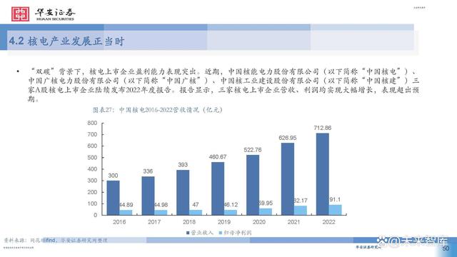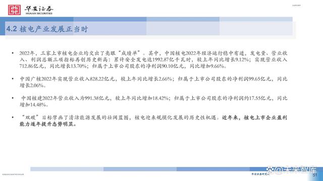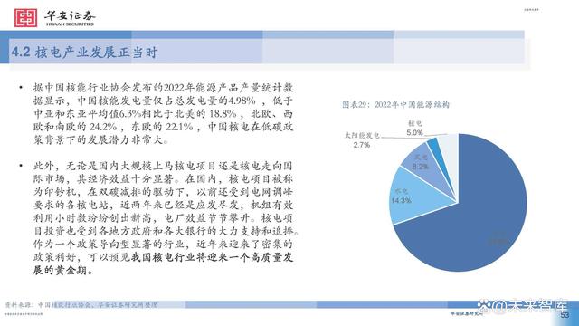 據(jù)中國核能行業(yè)協(xié)會(huì)發(fā)布的2022年能源產(chǎn)品產(chǎn)量統(tǒng)計(jì)數(shù) 據(jù)顯示,中國核能發(fā)電量僅占總發(fā)電量的4.98% ,低于 中亞和東亞平均值6.3%相比于北美的 18.8% ,北歐、西 歐和南歐的 24.2% ,東歐的 22.1% ,中國核電在低碳政 策背景下的發(fā)展?jié)摿Ψ浅4蟆?此外,無論是國內(nèi)大規(guī)模上馬核電項(xiàng)目還是核電走向國 際市場,其經(jīng)濟(jì)效益十分顯著。在國內(nèi),核電項(xiàng)目被稱 為印鈔機(jī),在雙碳減排的驅(qū)動(dòng)下,以前還受到電網(wǎng)調(diào)峰 要求的各核電站,近兩年來已經(jīng)是應(yīng)發(fā)盡發(fā),機(jī)組有效 利用小時(shí)數(shù)紛紛創(chuàng)出新高,電廠效益節(jié)節(jié)攀升。核電項(xiàng) 目投資也受到各地方政府和各大銀行的大力支持和追捧。 作為一個(gè)政策導(dǎo)向型顯著的行業(yè),近年來迎來了密集的 政策利好,可以預(yù)見我國核電行業(yè)將迎來一個(gè)高質(zhì)量發(fā) 展的黃金期。