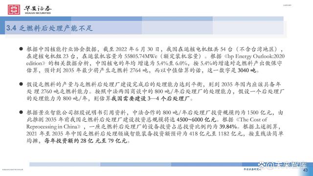 根據(jù)中國核能行業(yè)協(xié)會(huì)數(shù)據(jù),截至 2022 年 6 月 30 日,我國在運(yùn)核電機(jī)組共 54 臺(tái)(不含臺(tái)灣地區(qū)), 在建核電機(jī)組 23 臺(tái),在運(yùn)裝機(jī)容量為 55805.74MWe(額定裝機(jī)容量)。根據(jù)《bp Energy Outlook:2020 edition》的相關(guān)數(shù)據(jù)分析,中國核電的年均 增速為 5.4%至 6.0%,按 5.4%的增速對乏燃料產(chǎn)出做保守 估算,預(yù)計(jì)到 2035 年最少將產(chǎn)生乏燃料 2764 噸,而以中值估算的話,這一數(shù)字是 3040 噸。