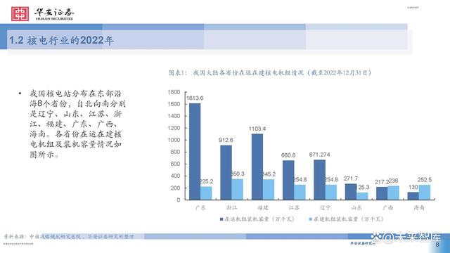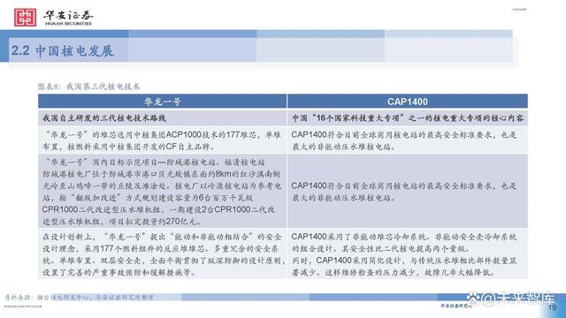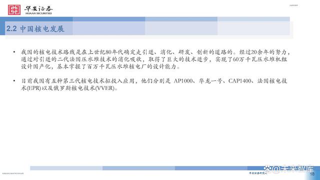 通過對國際先進(jìn)堆型的引進(jìn)和消化吸收,應(yīng)運(yùn)而生的自 主技術(shù)“華龍一號”國內(nèi)外首堆也相繼商運(yùn),標(biāo)志著我 國真正自主掌握了三代核電技術(shù),由核電大國進(jìn)入核電 強(qiáng)國。同時(shí),借鑒AP1000技術(shù)理念的自主三代核電技術(shù) “國和一號”示范工程有序開建,全球首座具有第四代 核電技術(shù)主要特征的高溫氣冷堆核電站示范工程實(shí)現(xiàn)成 功并網(wǎng)發(fā)電,全球首個(gè)陸上商用模塊化小堆“玲龍一號” 開建,標(biāo)志著我國核電水平躋身世界前列。