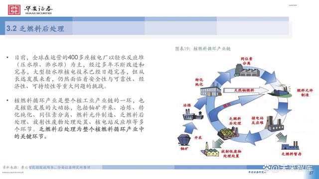 目前,全球在運(yùn)營的400多座核電廠以輕水反應(yīng)堆 (壓水堆、沸水堆)為主,經(jīng)過多年不斷改進(jìn)和 完善,大型輕水堆核電技術(shù)已經(jīng)日趨完善,但從 長遠(yuǎn)發(fā)展來看,仍然面臨著安全性與可靠性、經(jīng) 濟(jì)性、可持續(xù)性等重大問題的挑戰(zhàn)。 核燃料循環(huán)產(chǎn)業(yè)是整個(gè)核工業(yè)產(chǎn)業(yè)鏈的一環(huán),也 是核能發(fā)展的大動(dòng)脈,包括鈾礦開采、冶煉、轉(zhuǎn) 化純化、同位素分離、燃料元件制造、乏燃料后 處理、放射性廢物處理處置、核電站反應(yīng)堆等多 個(gè)環(huán)節(jié)。乏燃料后處理為整個(gè)核燃料循環(huán)產(chǎn)業(yè)中 的關(guān)鍵環(huán)節(jié)。