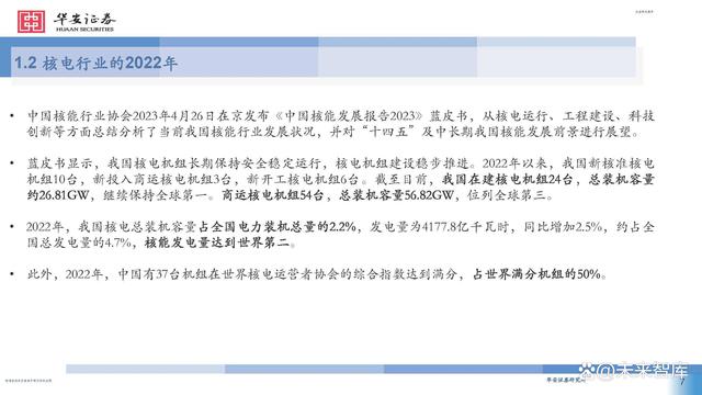 中國核能行業(yè)協(xié)會(huì)2023年4月26日在京發(fā)布《中國核能發(fā)展報(bào)告2023》藍(lán)皮書,從核電運(yùn)行、工程建設(shè)、科技 創(chuàng)新等方面總結(jié)分析了當(dāng)前我國核能行業(yè)發(fā)展?fàn)顩r,并對“十四五”及中長期我國核能發(fā)展前景進(jìn)行展望。藍(lán)皮書顯示,我國核電機(jī)組長期保持安全穩(wěn)定運(yùn)行,核電機(jī)組建設(shè)穩(wěn)步推進(jìn)。2022年以來,我國新核準(zhǔn)核電 機(jī)組10臺(tái),新投入商運(yùn)核電機(jī)組3臺(tái),新開工核電機(jī)組6臺(tái)。截至目前,我國在建核電機(jī)組24臺(tái),總裝機(jī)容量 約26.81GW,繼續(xù)保持全球第一。商運(yùn)核電機(jī)組54臺(tái),總裝機(jī)容量56.82GW,位列全球第三。 2022年,我國核電總裝機(jī)容量占全國電力裝機(jī)總量的2.2%,發(fā)電量為4177.8億千瓦時(shí),同比增加2.5%,約占全國總發(fā)電量的4.7%,核能發(fā)電量達(dá)到世界第二。 此外,2022年,中國有37臺(tái)機(jī)組在世界核電運(yùn)營者協(xié)會(huì)的綜合指數(shù)達(dá)到滿分,占世界滿分機(jī)組的50%。