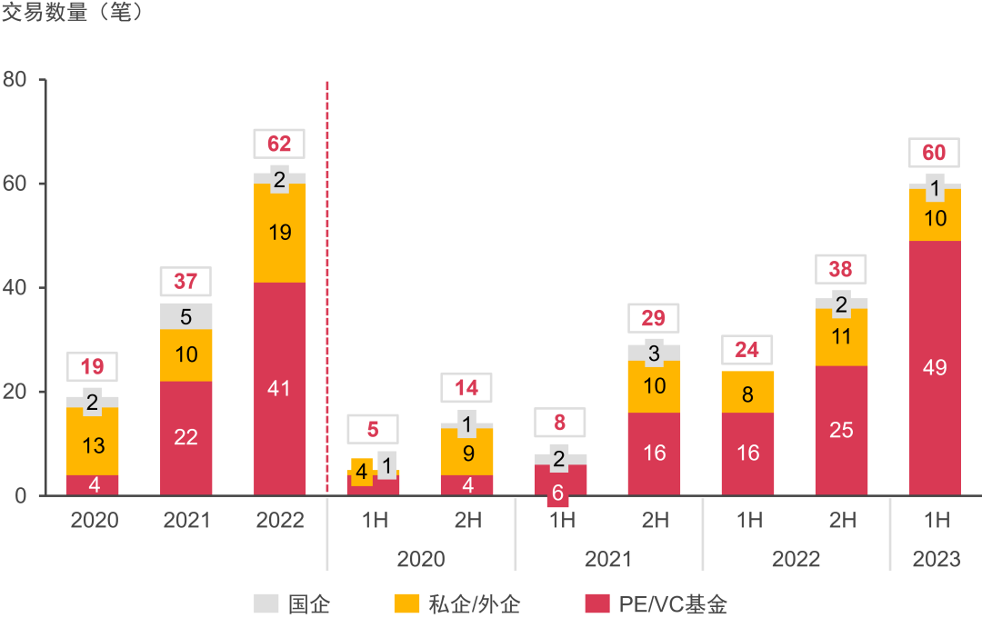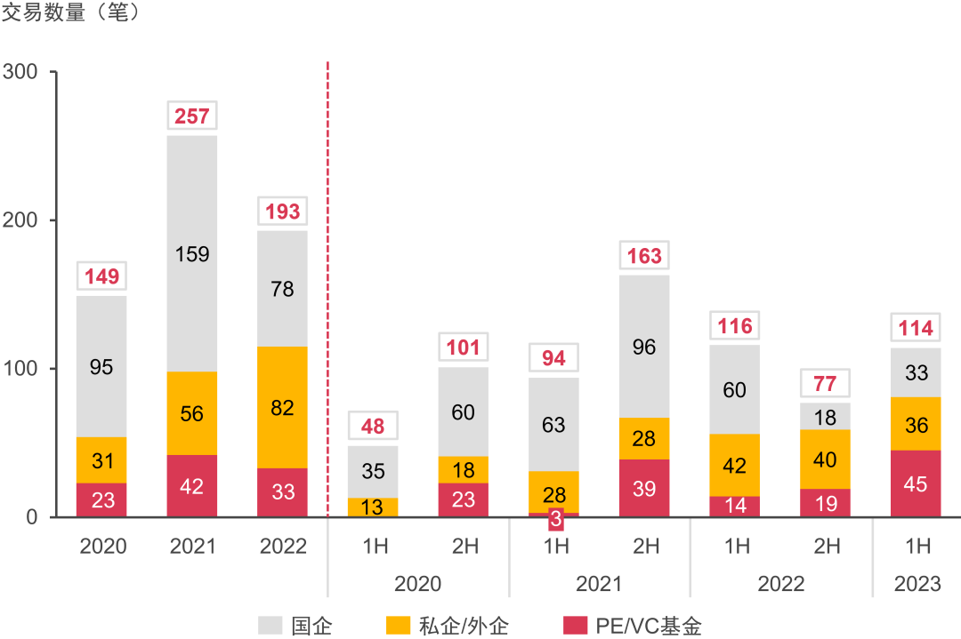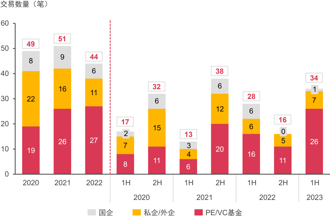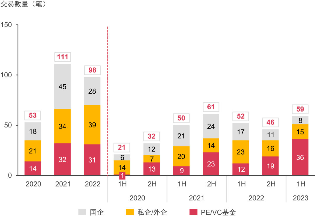 國(guó)企整體投資熱度有所下降,上半年僅有兩筆交易;顯示出國(guó)企對(duì)于行業(yè)成熟度提高后的投資謹(jǐn)慎性。