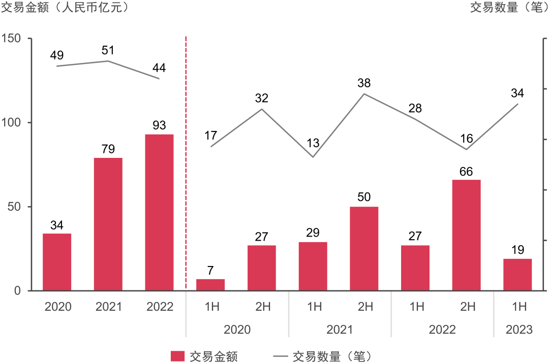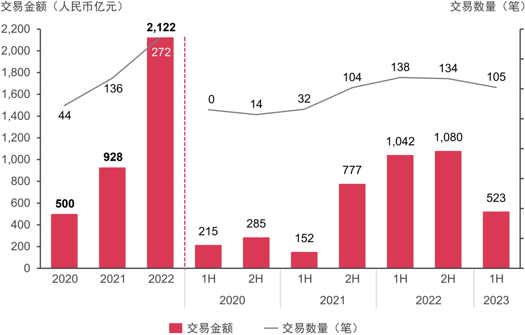 2020年至2023年上半年基礎(chǔ)設(shè)施交易金額及數(shù)量