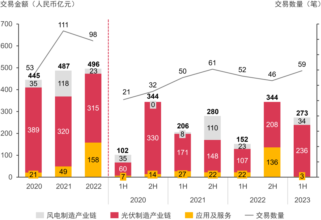2020年至2023年上半年風(fēng)電及光伏產(chǎn)業(yè)鏈并購(gòu)交易數(shù)量及金額