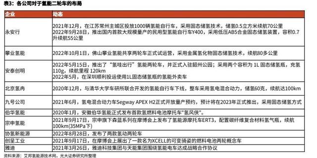 目前氫能二輪車布局主要來自于二輪車企業(yè)向氫能業(yè)務(wù)擴展。如永安行2B端推出Y200,2C端針對歐洲市場推出Y400。雅迪科技集團與天能集團圍繞氫能達成合作協(xié)議。