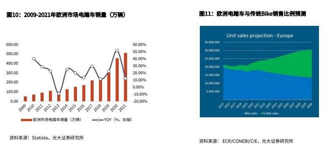 歐洲電踏車預(yù)計后續(xù)持續(xù)高速增長。歐洲電動自行車市場以德國、法國、意大利和荷蘭市場為主導(dǎo),預(yù)計歐洲地區(qū)的年均電動自行車購買量將從2019年的370萬輛增長到2030年的1700萬輛,歐洲自行車協(xié)會(CONEBI)預(yù)計2030年歐洲電動車市場滲透率將突破50%,整體市場增長潛力可期。