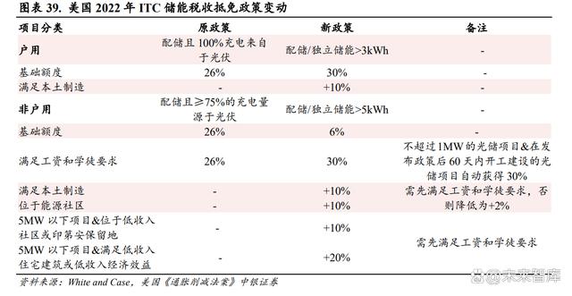 儲能稅收減免提升至以 30%為基礎(chǔ),經(jīng)濟性進一步提升。 此前的 ITC 政策稅收抵免的基礎(chǔ)額度為 26%,現(xiàn)在在滿足工資和學(xué)徒要求后,基礎(chǔ)抵免可以達(dá)到 30%,另外,如果同時能夠滿足其他條件, 例如本土制作、位于能源社區(qū)等可進一步提升抵免的額度,儲能電站的經(jīng)濟性得到進一步提升。