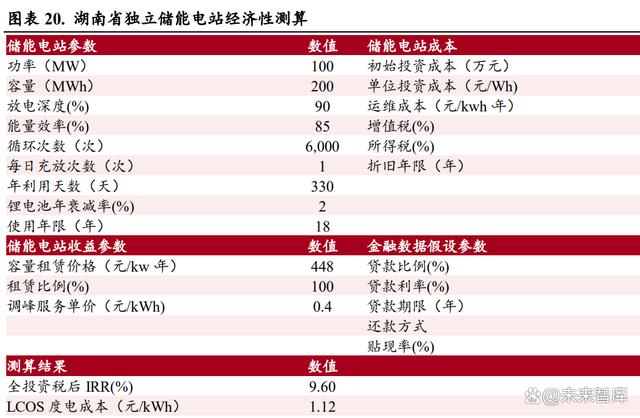 獨立儲能電站經(jīng)濟性可觀。我們以湖南省的實際情況為例,來測算獨立儲能電站的經(jīng)濟性,在目前 的各種條件下,湖南省獨立儲能電站的全投資稅后 IRR 達(dá)到 9.60%,具有客觀的收益性。 1)容量租賃收入假設(shè):參考湖南省的城步儒林 100MW/200MWh 儲能電站項目已經(jīng)簽訂的容量租賃 合同,湖南省的容量租賃價格為 448 元/kw*年。2)電力輔助服務(wù)收入假設(shè):電力輔助服務(wù)包括為電網(wǎng)公司提供調(diào)峰、調(diào)頻等服務(wù),按照每次調(diào)用規(guī) 模及調(diào)用次數(shù),電網(wǎng)公司給儲能電站支付費用。 參考湖南省的現(xiàn)行 政 策以及城步儒林 100MW/200MWh 儲能電站項目的運行情況,假設(shè)一年調(diào)用 330 天,每天一次充放,調(diào)用費用為每 次 400 元/MWh。