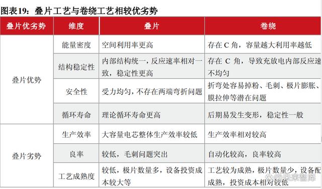 因此疊片工藝的電池理論上擁有更高體積能量密度上限、更穩(wěn)定的內(nèi)部結(jié)構(gòu)和更長(zhǎng)的循環(huán)次數(shù)。全模切極耳數(shù)量變?yōu)閮杀?,可解決電子電導(dǎo)的集流問(wèn)題,提升電池快充性能。此外,疊片技術(shù)還可減少Pack零部件數(shù)量,提升電池集成度,有利于減少儲(chǔ)能系統(tǒng)占地面積和土建支出。