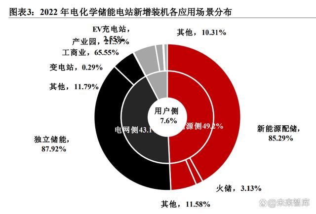 主要場(chǎng)景包括工商業(yè)、產(chǎn)業(yè)園、EV充電站、港口岸電、其他海島/校園/社區(qū)等。儲(chǔ)能裝置在用電低谷時(shí)充電,在用電高峰時(shí)放電,利用高峰和低谷的電價(jià)差,節(jié)省用電費(fèi)用,從中可獲取經(jīng)濟(jì)效益,因此戶用儲(chǔ)能主要集中在高電價(jià)及高電價(jià)差的國(guó)家或地區(qū)。國(guó)內(nèi)用戶側(cè)以工商業(yè)儲(chǔ)能(占比65.55%)為主,產(chǎn)業(yè)園儲(chǔ)能、EV充電站的占比也在逐漸提升,在新增裝機(jī)中占比21.59%、2.55%。