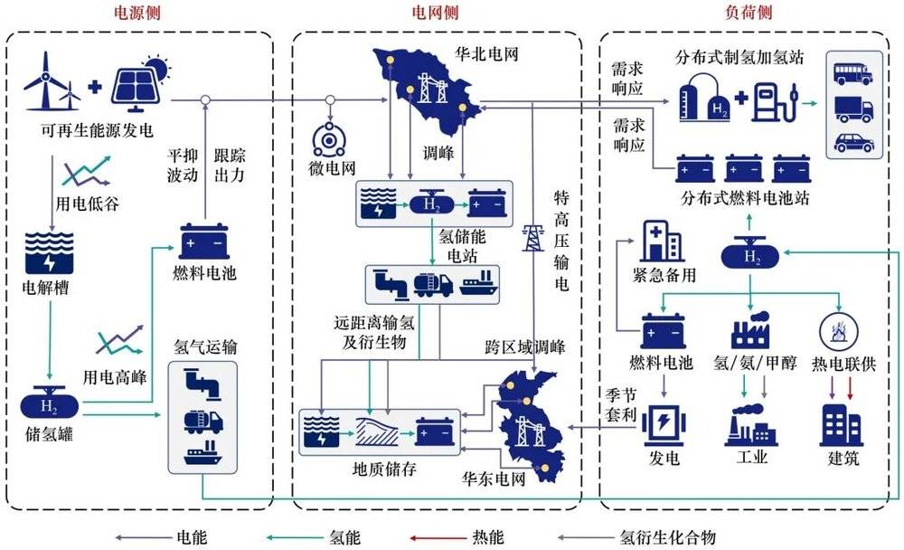 加快發(fā)展氫能產(chǎn)業(yè),是應(yīng)對實現(xiàn)“碳達峰、碳中和”目標和保障國家能源安全的戰(zhàn)略選擇。氫儲能具有跨季節(jié)、跨區(qū)域和大規(guī)模存儲的優(yōu)勢,在能量維度、時間維度和空間維度上具有突出優(yōu)勢,在新型電力系統(tǒng)的“源網(wǎng)荷”各個環(huán)節(jié)均有很強的應(yīng)用價值,可在新型電力系統(tǒng)建設(shè)中發(fā)揮重要作用。
