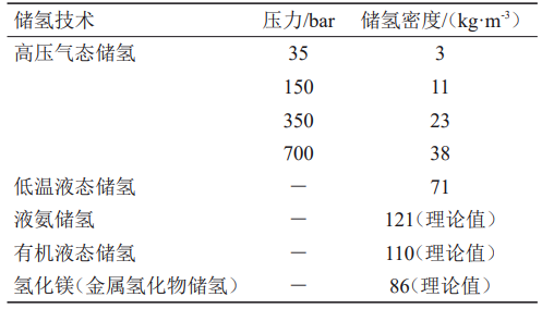 與其他燃料相比,氫的質(zhì)量能量密度大,但體積能量密度低(汽油的1/3000),因此構(gòu)建氫儲能系統(tǒng)的重要前提條件之一是在較高體積能量密度下儲存氫氣。目前,主要儲氫方式可以分為物理儲氫和化學儲氫。物理儲氫包括高壓氣態(tài)儲存技術(shù)、低溫液態(tài)儲存技術(shù)和地質(zhì)儲氫技術(shù);化學儲氫包括固態(tài)儲存技術(shù)、有機液態(tài)儲氫技術(shù)和液氨儲氫技術(shù)。不同儲氫技術(shù)的密度如表2所示。