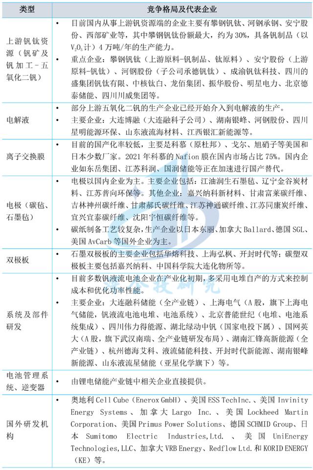 當(dāng)前國(guó)內(nèi)全釩液流電池市場(chǎng)總體體量較小,龍頭格局未顯,產(chǎn)業(yè)仍處于發(fā)展初期。產(chǎn)業(yè)鏈各環(huán)節(jié)的競(jìng)爭(zhēng)格局和代表企業(yè)如下表所示。