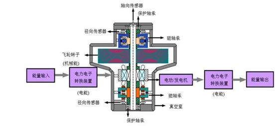 ——工作原理。飛輪儲(chǔ)能的原理是利用過(guò)剩電力給真空外殼中的轉(zhuǎn)子(飛輪)加速,把電能以動(dòng)能的形式儲(chǔ)存。在儲(chǔ)能階段,通過(guò)電動(dòng)機(jī)拖動(dòng)飛輪,使飛輪本體加速到一定的轉(zhuǎn)速,將電能轉(zhuǎn)化為動(dòng)能;在能量釋放階段,飛輪的旋轉(zhuǎn)速度會(huì)降低,電動(dòng)機(jī)作發(fā)電機(jī)運(yùn)行,將動(dòng)能轉(zhuǎn)化為電能。一般來(lái)說(shuō),飛輪系統(tǒng)使用電流來(lái)控制飛輪速度,其中高能的飛輪使用高強(qiáng)度碳纖維制成的轉(zhuǎn)子,并通過(guò)磁懸浮軸承實(shí)現(xiàn)懸浮。這些轉(zhuǎn)子在真空罩內(nèi)的轉(zhuǎn)速可達(dá)到20000-50000rpm,可以在幾分鐘內(nèi)達(dá)到所需的速度。