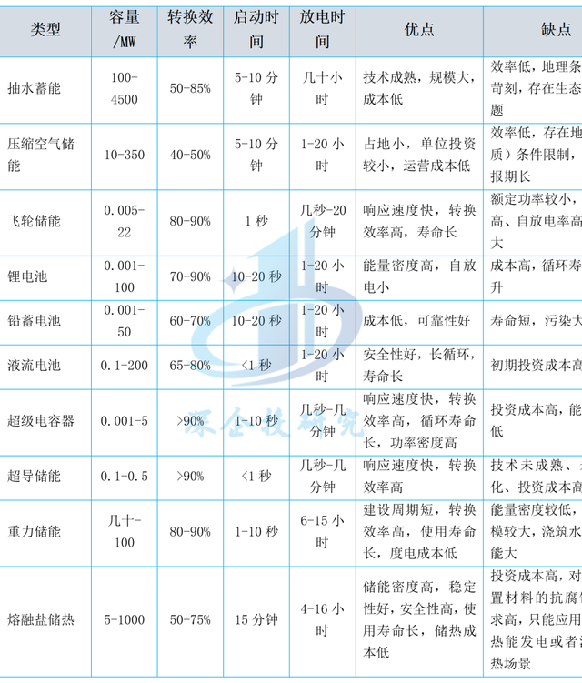 儲(chǔ)能技術(shù)呈現(xiàn)多元化發(fā)展格局,各有不同的應(yīng)用場(chǎng)景。每種儲(chǔ)能技術(shù)均具有一定的獨(dú)特性,在實(shí)際應(yīng)用中,需要用戶(hù)綜合考慮各種儲(chǔ)能技術(shù)的特點(diǎn)以及優(yōu)缺點(diǎn),選擇最適宜的技術(shù)方案。比如,飛輪儲(chǔ)能、超級(jí)電容、超導(dǎo)儲(chǔ)能可以解決秒級(jí)或分鐘級(jí)以下的調(diào)頻需求;抽水蓄能、壓縮空氣儲(chǔ)能、燃料電池和電化學(xué)儲(chǔ)能等則更適用于進(jìn)行小時(shí)級(jí)調(diào)峰;氫儲(chǔ)能適合執(zhí)行季節(jié)性調(diào)峰。不同儲(chǔ)能技術(shù)的特點(diǎn)如下表所示。