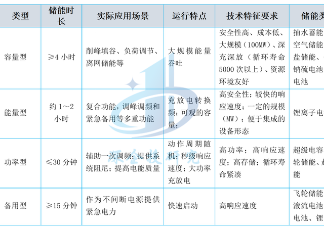 按照時(shí)長(zhǎng)要求的不同,儲(chǔ)能的應(yīng)用場(chǎng)景可分為容量型(≥4小時(shí))、能量型(約1~2小時(shí))、功率型(≤30分鐘)和備用型(≥15分鐘)四類(lèi),對(duì)應(yīng)的應(yīng)用場(chǎng)景如下表所示。