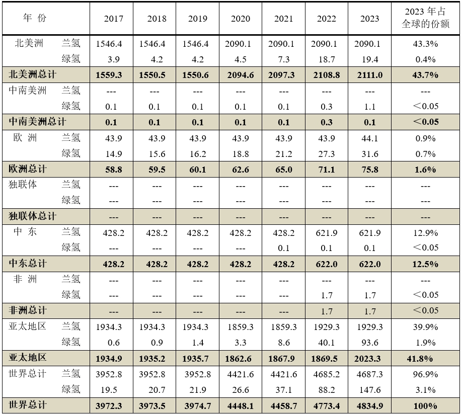 縱觀全球2023年氫氣生產(chǎn)仍然以從化石燃料制氫“蘭氫”為主,占96.9%,而從再生能源制氫“綠氫”為輔,僅占3.1%,再生能源制氫是發(fā)展方向,但中南美洲、獨(dú)聯(lián)體、非洲等地區(qū)的蘭氫沒(méi)有行動(dòng);獨(dú)聯(lián)體、中東和非洲的“綠氫”也沒(méi)有行動(dòng)。