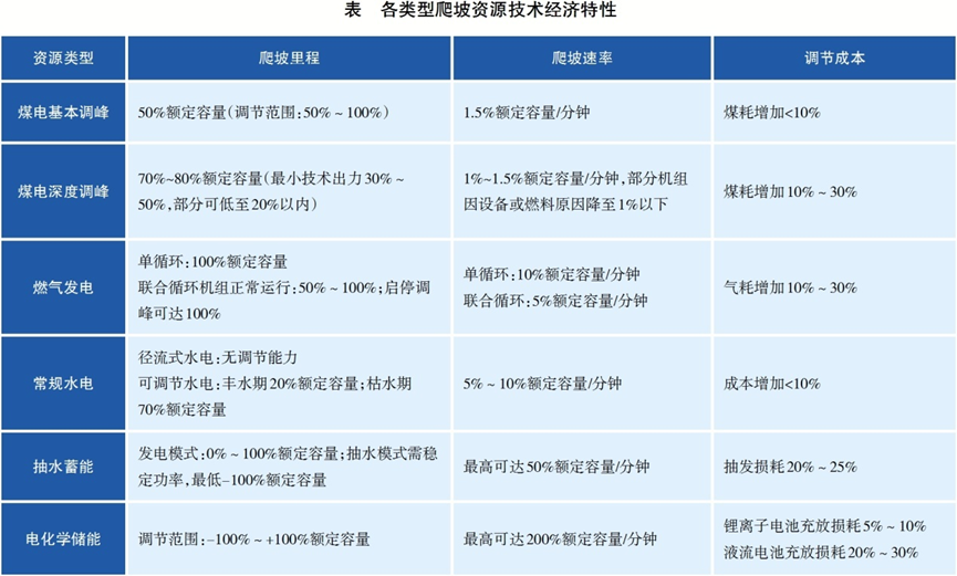 系統(tǒng)爬坡能力需基于各類型爬坡資源技術(shù)經(jīng)濟(jì)特性開展分析。從爬坡速率和里程等調(diào)節(jié)性能看,電化學(xué)儲(chǔ)能和抽水蓄能普遍優(yōu)于煤電、氣電等火電電源,可調(diào)節(jié)水電枯水期的調(diào)節(jié)能力優(yōu)于豐水期;從調(diào)節(jié)成本看,煤電基本調(diào)峰和常規(guī)水電調(diào)節(jié)成本較低,氣電調(diào)峰次之,抽水蓄能與電化學(xué)儲(chǔ)能的成本取決于抽發(fā)電價(jià)差與轉(zhuǎn)換效率,煤電深度調(diào)峰成本較高。