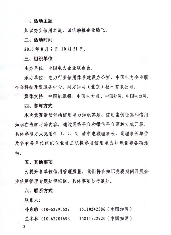 為進(jìn)一步落實(shí)中共中央、國務(wù)院《關(guān)于進(jìn)一步深化電力體制改革的若干意見》(中發(fā)〔2015〕9號),深化《社會信用體系建設(shè)規(guī)劃綱要(2014-2020年)》精神,普及信用知識,提升電力行業(yè)從業(yè)人員誠信意識,結(jié)合國家有關(guān)部委對信用體系建設(shè)工作的最新要求,中國電力企業(yè)聯(lián)合會攜手清華同方知網(wǎng),再次強(qiáng)強(qiáng)合作,共同舉辦2016“信用電力”知識競賽活動。